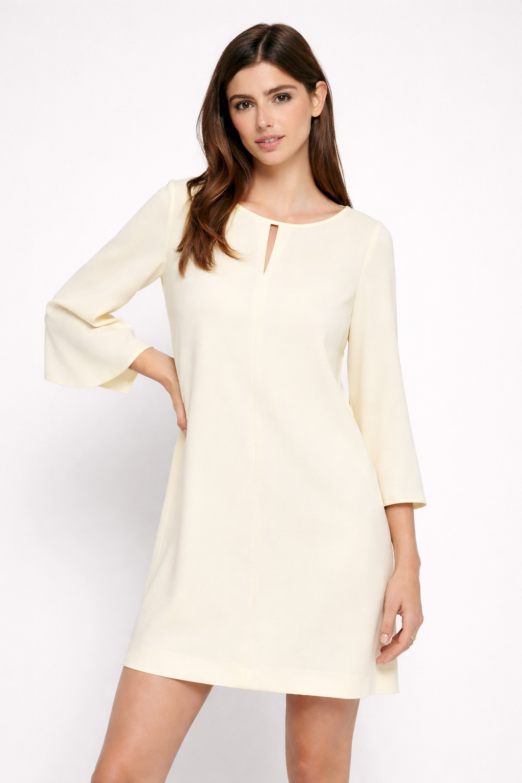 • Φόρεμα με λαιμόκοψη από ελαστικό ύφασμα, με μανίκια ¾ με ελαφρώς φουσκωτό στρίφωμα διακοσμημένο στο πλάι. Μήκος: 88 cm.