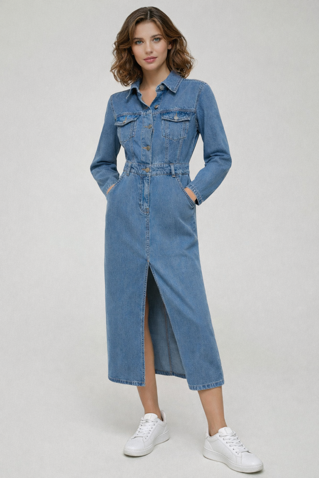 The structured silhouette of the denim shirt dress is created through precise cutting, resolving your look in just one move.