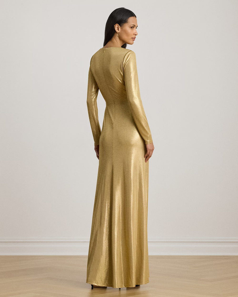 Cut from stretch jersey with a metallic finish, this evening gown is characterised by a twist-front accent and a statuesque column silhouette, making it a striking choice for your next occasion.