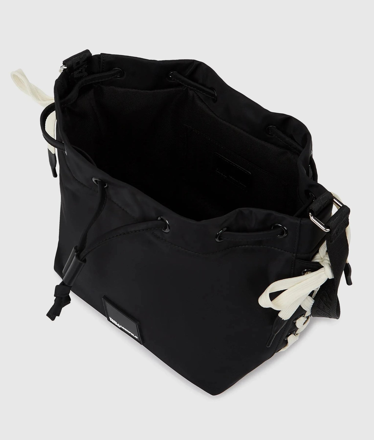 Bold lace-up sides and drawstring detailing add edge to this nylon bucket bag, finished with a rubber KARL LAGERFELD JEANS logo and an adjustable crossbody strap for versatile wear.
