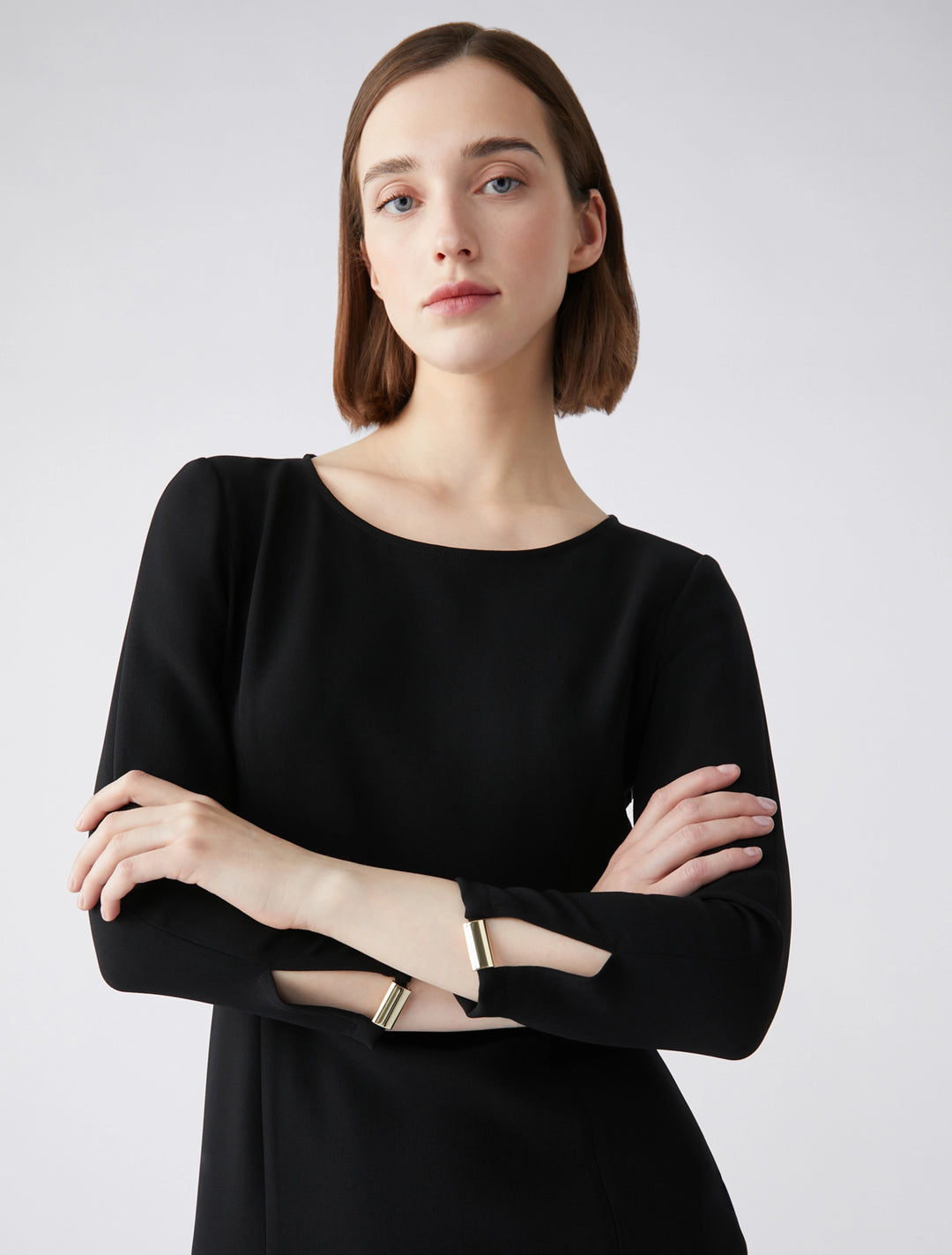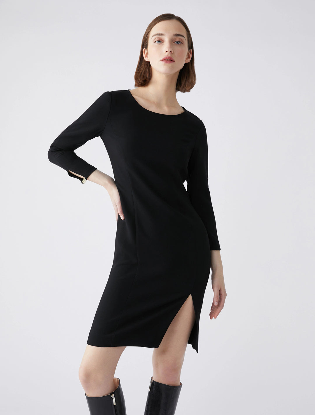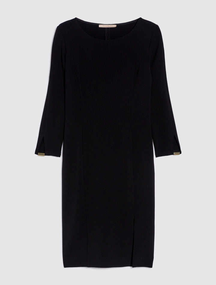 - Αυτό το φόρεμα είναι ένα must-have. Στρογγυλεμένη λαιμόκοψη, μανίκια τρία τέταρτα με κομμένη λεπτομέρεια και μεταλλική μπάρα, σκίσιμο μπροστά. Κρυφό φερμουάρ, χωρίς επένδυση.
