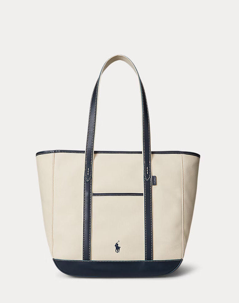 Ralph Lauren Leather-Trim Canvas Medium Shopper Tote Bag | Navy/Ecru