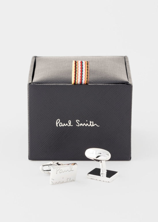 • Μανικετόκουμπα σε ασημί τόνους με μεγάλο λογότυπο με την υπογραφή Paul Smith, με γυαλιστερό φινίρισμα και ανάγλυφα κουμπώματα.