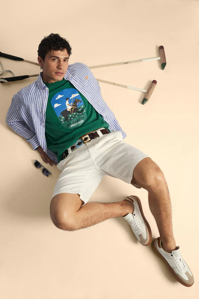 Ανδρικό μακρυμάνικο πουκάμισο από ύφασμα 100% linen με δίχρωμες κάθετες ρίγες. Η κανονική γραμμή εξασφαλίζει άνεση και ευελιξία, ενώ συμπληρώνεται από γιακά με κουμπιά και Custom σχεδιασμένα κουμπιά. Το εμβληματικό κεντημένο λογότυπο σε αντίθεση χρωμάτων στο στήθος προσδίδει στο σχέδιο μια διακριτική κομψότητα. Το μοντέλο φοράει μέγεθος L.
