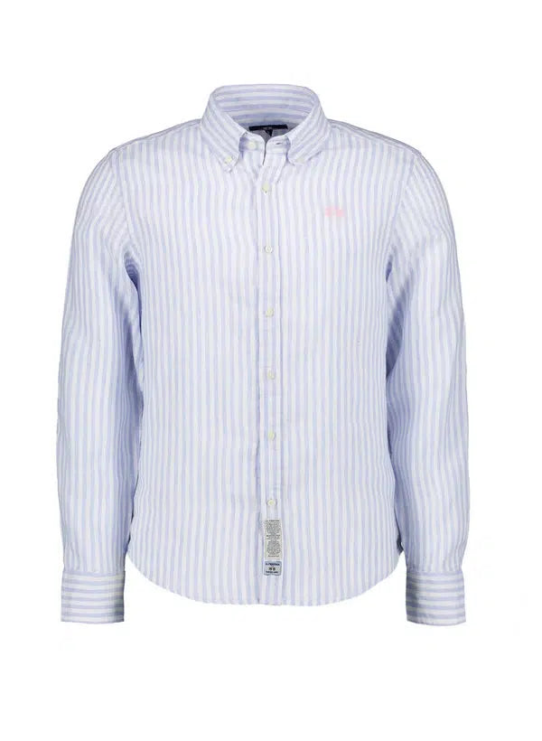 Ανδρικό μακρυμάνικο πουκάμισο από ύφασμα 100% linen με δίχρωμες κάθετες ρίγες. Η κανονική γραμμή εξασφαλίζει άνεση και ευελιξία, ενώ συμπληρώνεται από γιακά με κουμπιά και Custom σχεδιασμένα κουμπιά. Το εμβληματικό κεντημένο λογότυπο σε αντίθεση χρωμάτων στο στήθος προσδίδει στο σχέδιο μια διακριτική κομψότητα. Το μοντέλο φοράει μέγεθος L.