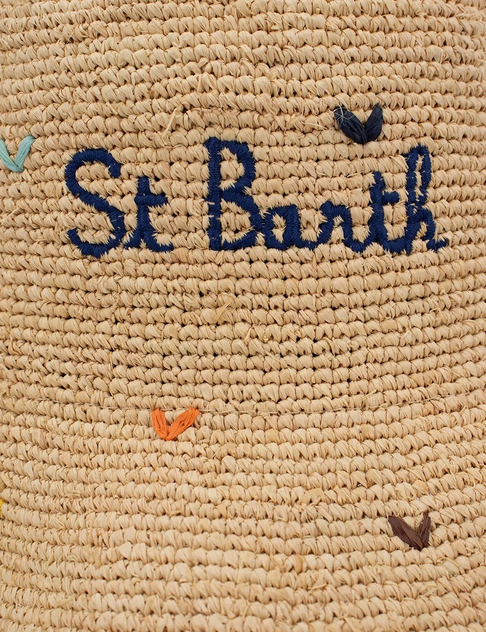 Λεπτά κεντημένα μοτίβα με μικρές καρδούλες σε μια ποικιλία απαλών αποχρώσεων αναδεικνύουν το ανοιχτόχρωμο καπέλο τύπου «bucket» με φαρδύ γείσο. Το αδόμητο σχήμα φέρει το λογότυπο «St Barth» σε μπλε ναυτικό χρώμα στο μπροστινό μέρος, προσδίδοντας μια κομψή, εκλεκτική αίσθηση με λεπτομέρειες που ξεχωρίζουν οπτικά σε όλη την επιφάνειά του.