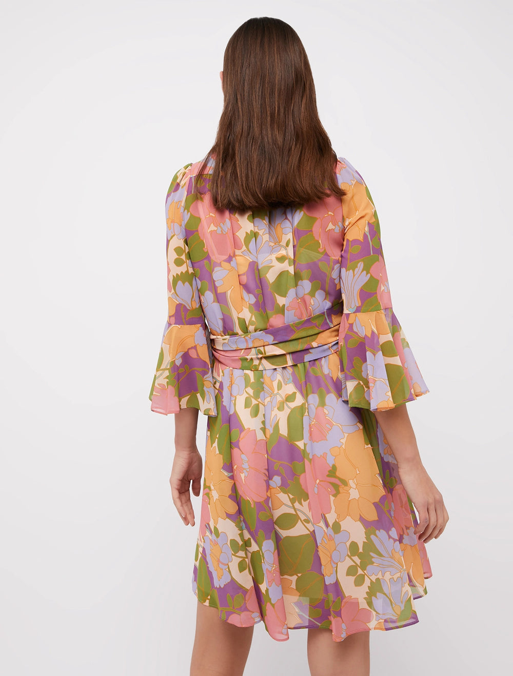 - Κομψό φόρεμα georgette εμπνευσμένο από τα 70’s με μεγάλο μοτίβο λουλουδιών. Σταυρωτή λαιμόκοψη, μανίκια τριών τετάρτων . Κρυφό φερμουάρ, τζέρσεϊ.