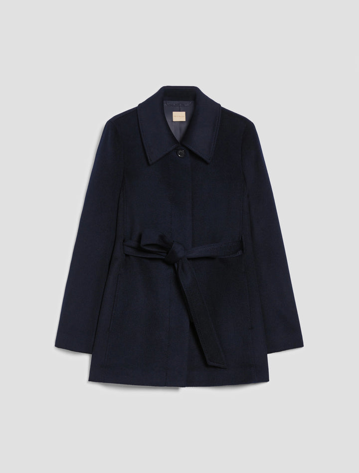 This elegant yet versatile pure wool broadcloth jacket can be worn straight or cinched via the matching belt; this can either be tied in classic fashion or threaded solely through the front.