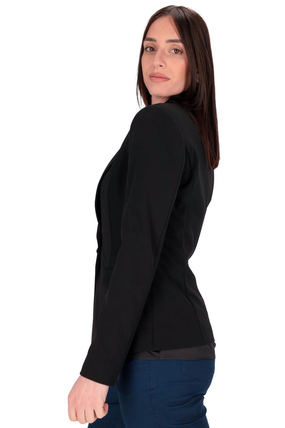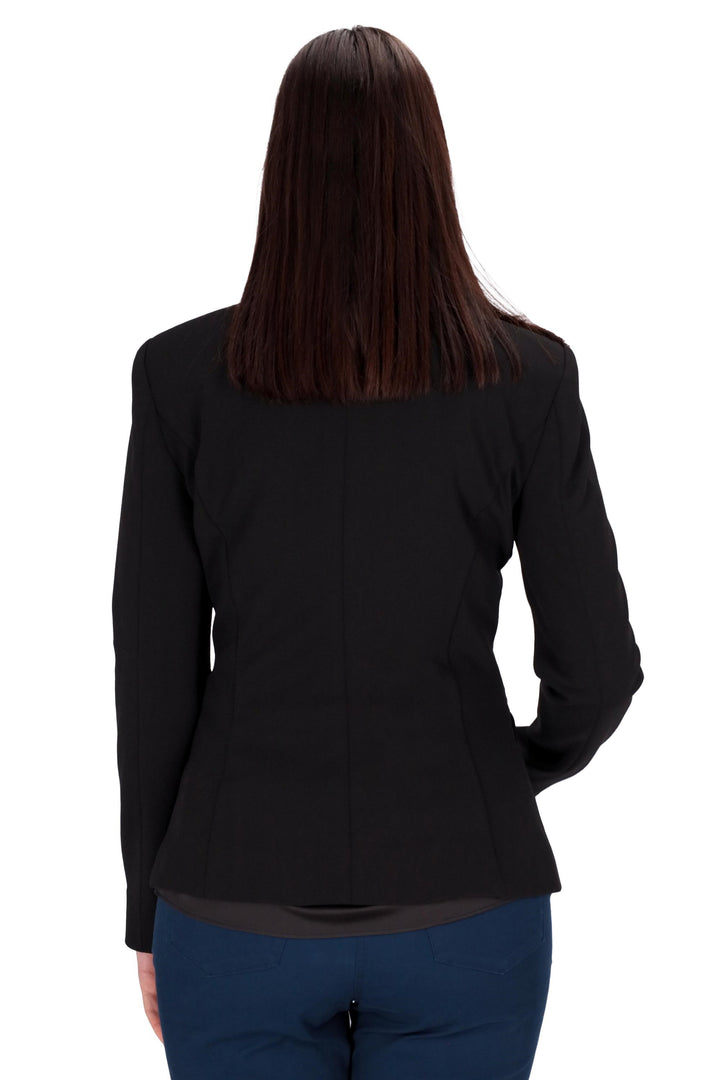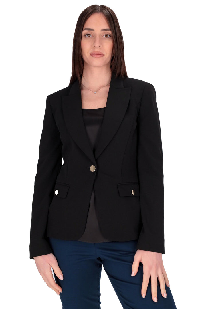 Full Milano-knit single-breasted crepe jersey blazer. The slim-fit model boasts peak lapels, welt pockets and metal button detail. Partially lined model.