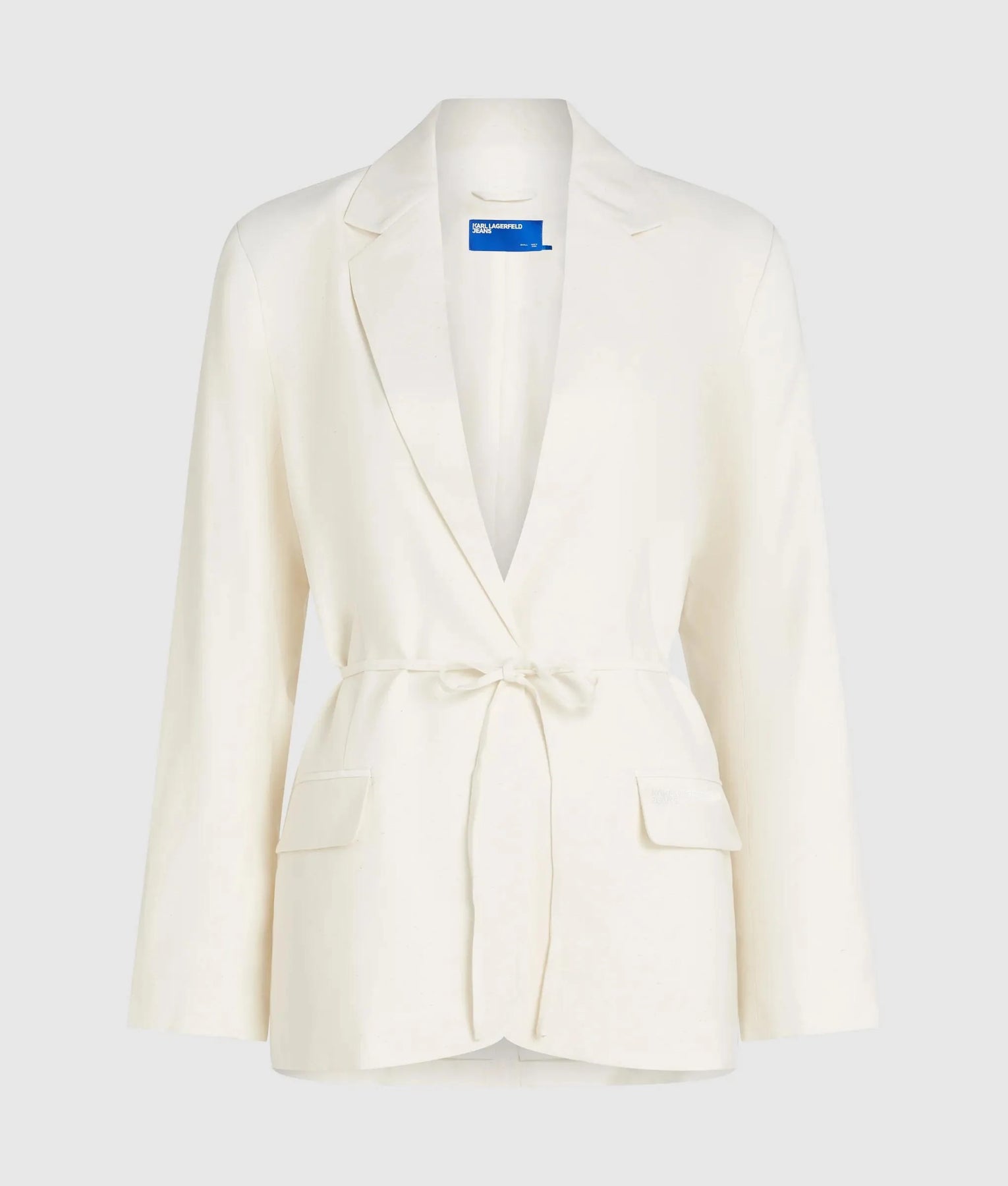 A sleek tie waist blazer with a polished silhouette and subtle tonal logo embroidery, designed to refine your look with an adjustable fit.