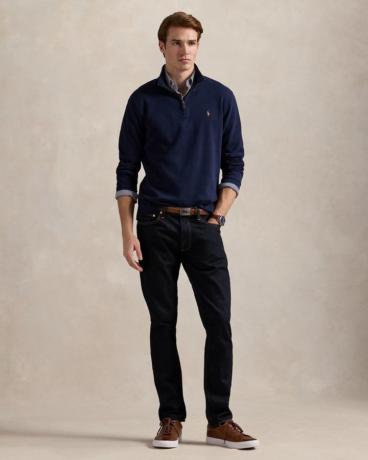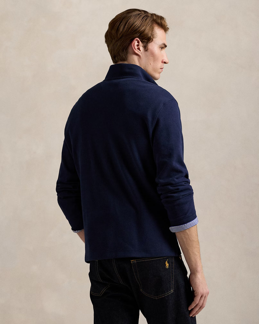 Mockneck. Quarter-zip placket. Zip pull custom-developed with a "Polo" logo.