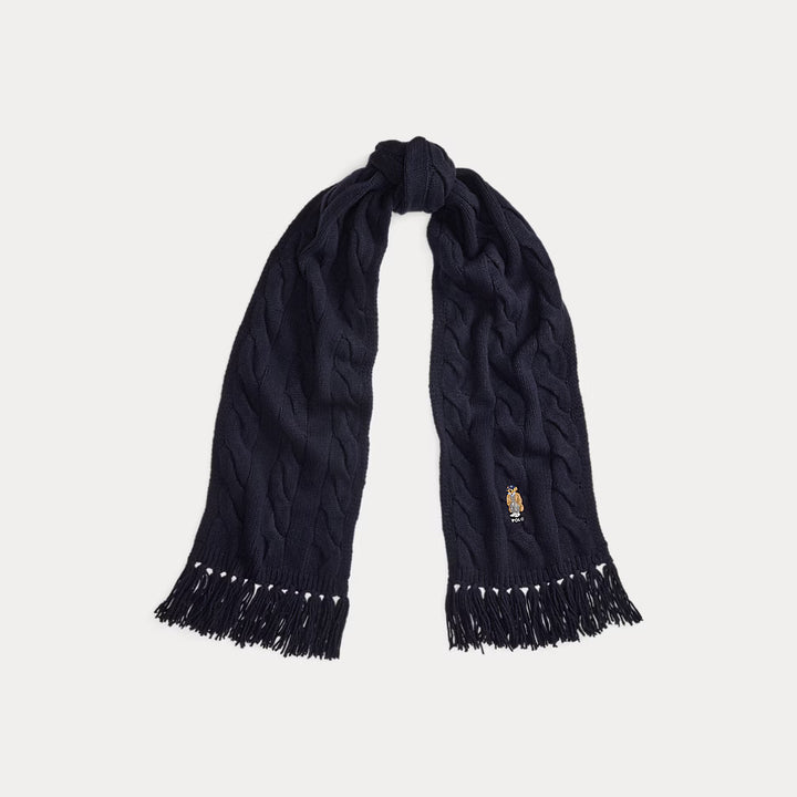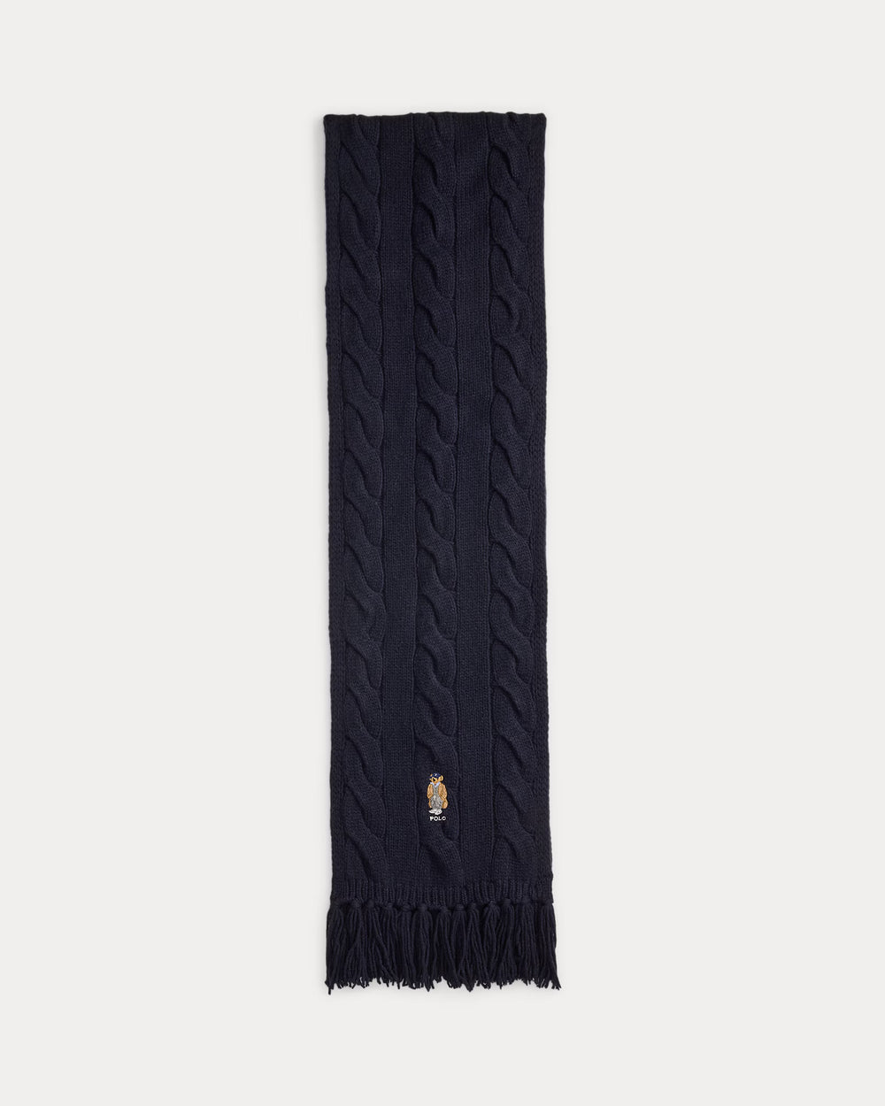 Cable-knit with a warm blend that includes wool, this scarf showcases our embroidered Polo Bear at one end and is accented with fringe trim at the edges.