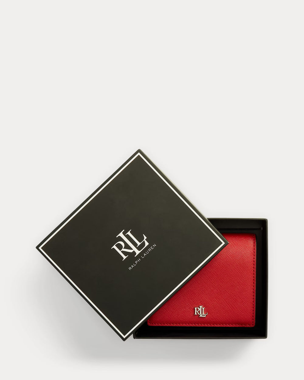 Crafted with crosshatch leather, this wallet features a compact, bi-fold design with multiple card slots and pockets. Polished "LRL" hardware at the front adds signature style.