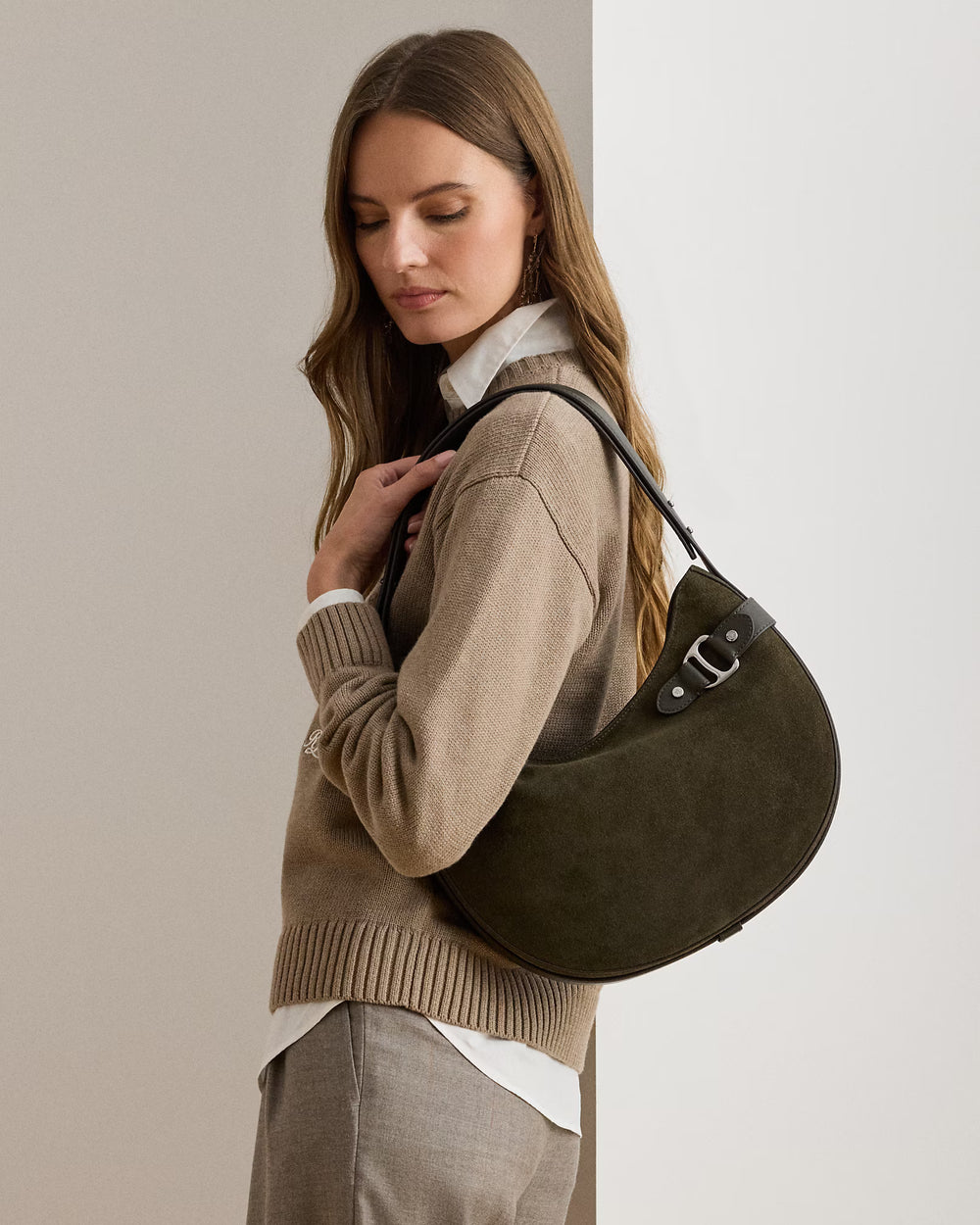 Crafted with a luxurious combination of suede and supple full-grain leather trim, the large Tasha shoulder bag captures Ralph Lauren's iconic spirit with an equestrian-inspired D-ring and a modern, curved asymmetrical silhouette. An adjustable shoulder strap provides versatile styling options.