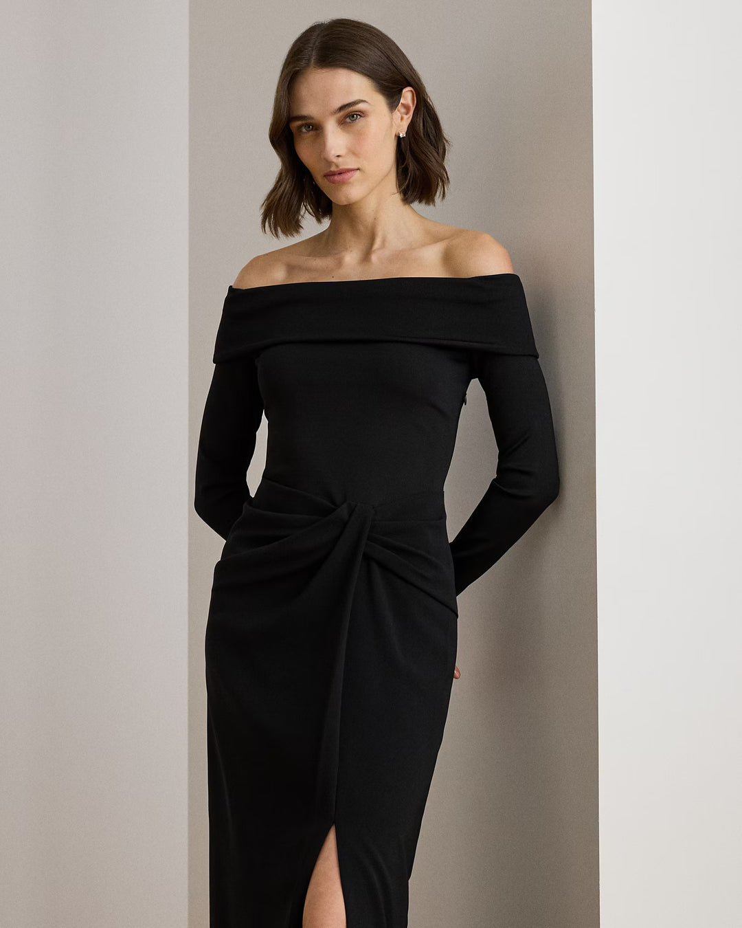 Timeless and elegant, this column gown combines a rib-knit off-the-shoulder bodice with a wrap-style crepe skirt.