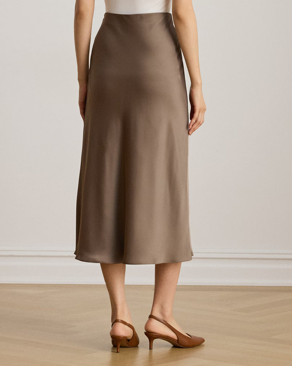 A staple piece that can be easily dressed up or down, this midi skirt is rendered in silky satin charmeuse for a fluid drape and subtle sheen.