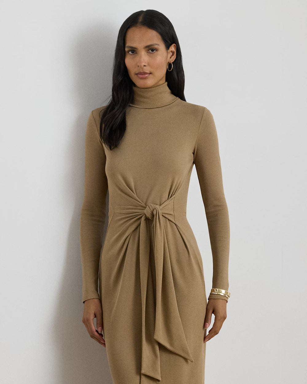 Rib-knit from a soft stretch-cotton blend, this roll neck dress is cut for a slim-fitting silhouette and a calf-grazing midi length. A tie-front design on the waist adds contemporary flare to this refined piece, while slits on the hem afford ease of movement.
