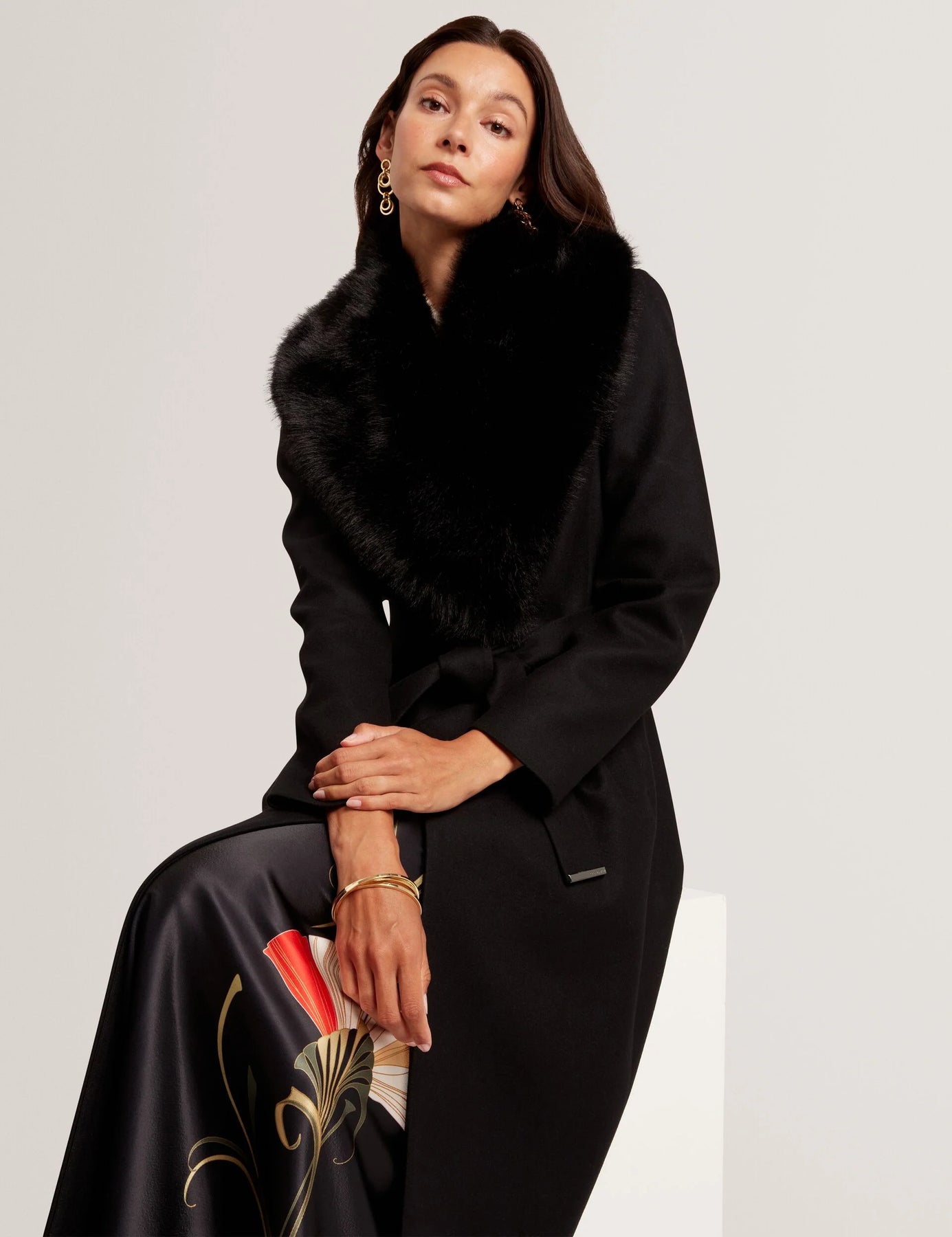A sophisticated long faux fur coat with a matching belt, combining glamour and warmth.