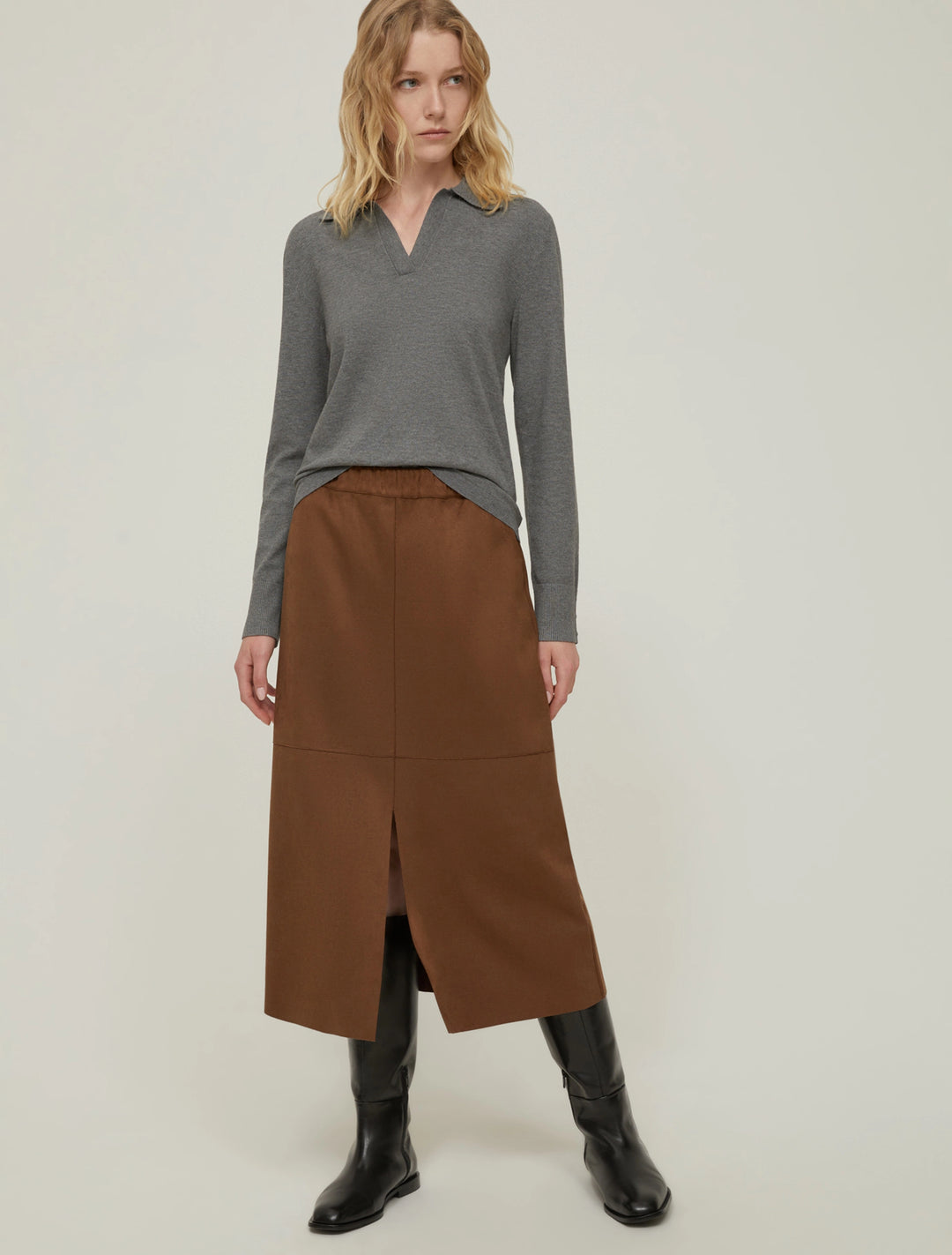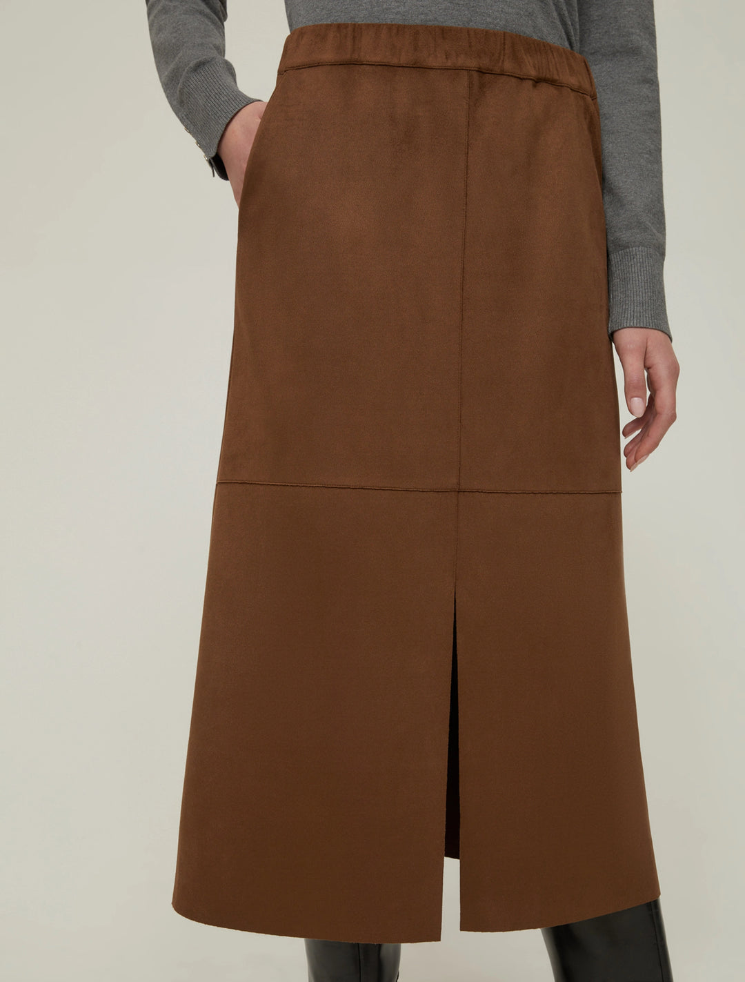 This velvety jersey midi skirt boasts a comfort-focused style: a simple sweater will suffice for a comfortable yet chic day-to-night look.