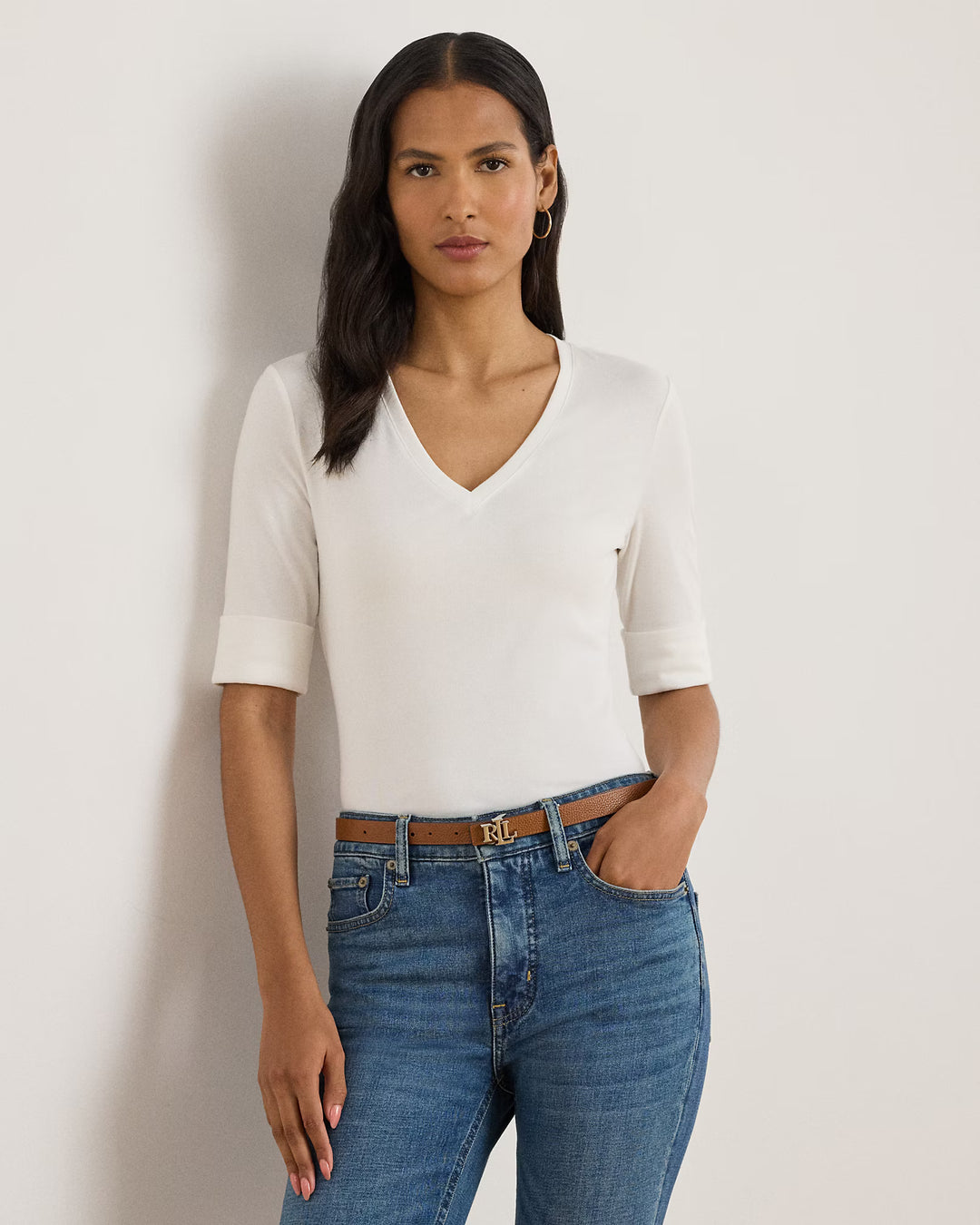 Lauren Ralph Lauren Stretch Cotton Elbow-Sleeve V-Neck Tee | White